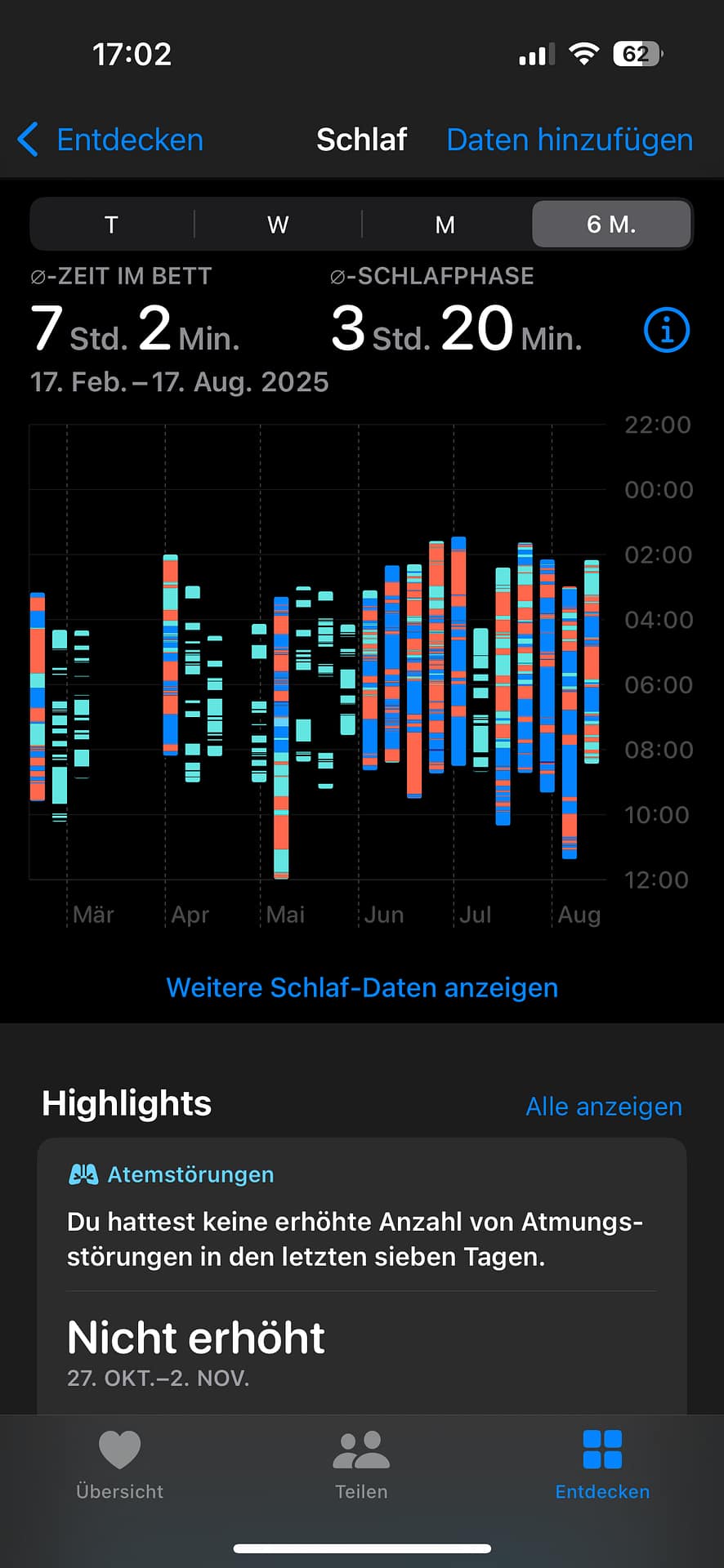 Alle über die Apple Health App erfassbaren Gesundheitsdaten erfasse ich seit November 2023 nahezu durchgehend 24/7mit einer Apple Watch Series 9