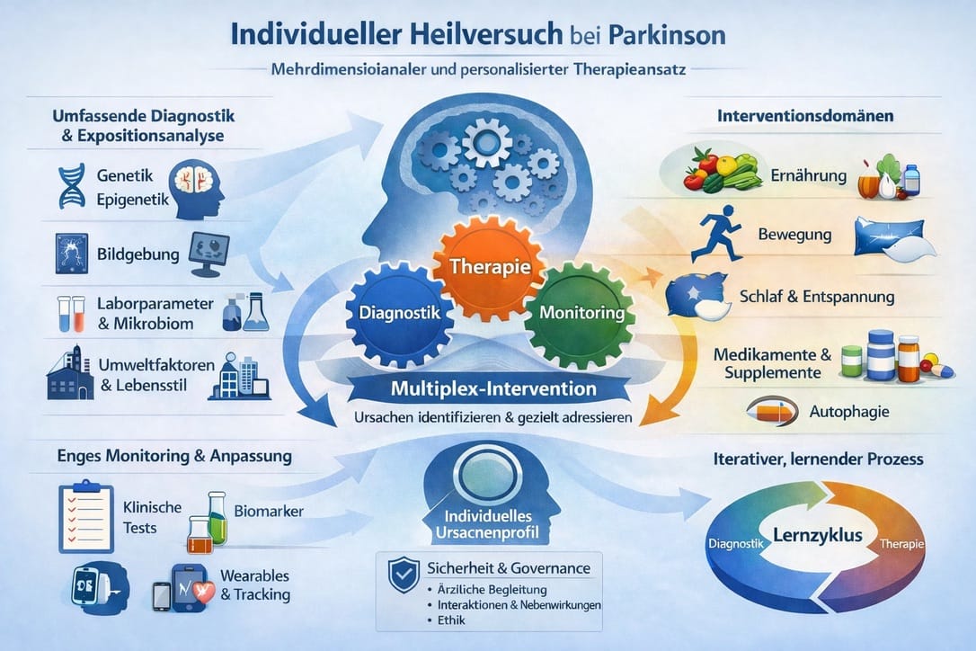 Diese Leitidee passt auffällig gut zu einer wachsenden Kritik an dominanten, oft implizit monokausalen Parkinson-Narrativen. So argumentiert „Redefining the hypotheses driving Parkinson’s diseases research“, dass Parkinson-Forschung lange dazu tendierte, „die“ Erkrankung als eine zentrale, primär im Gehirn verankerte Entität zu behandeln, obwohl zunehmend plausibel wird, dass unterschiedliche Kombinationen genetischer, umweltbedingter und komorbider Faktoren verschiedene Krankheitsverläufe erzeugen können – mit Konsequenzen für Biomarker, Stratifizierung und Therapieentwicklung. [1] Diese Neubewertung liefert dem Projekt nicht die Gewissheit eines Erfolgs, aber einen belastbaren wissenschaftlichen Rahmen: Wenn Parkinson eher ein Syndromraum heterogener Ursachenpfade ist, dann ist ein individualisierter, multimodaler Erkenntnis- und Interventionsansatz zumindest logisch konsistent mit dem Gegenstand. [1]